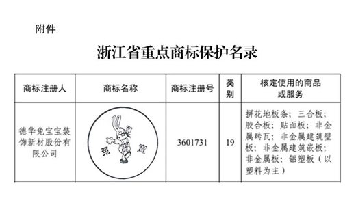 “兔宝宝”商标入选“浙江省重点商标保护名...