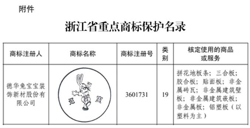 近日,浙江省市场监督管理局(浙江省知识产权局)依据《浙江省知识产权保护和促进条例》及《浙江省重点商标保护名录管理办法》,正式将“兔宝宝”商标纳入“浙江省重点商标保护名录”,这也是公司继获湖州市重点商标保护名录后的又一殊荣。这一荣誉不仅是对“兔宝宝”品牌市场影响力与商业价值的权威背书,更标志着公司知识产权保护工作迈入省级重点护航新阶段。