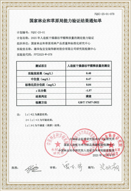 由建研院检测中心有限公司组织的“CABR-2025-PT55人造板甲醛释放量检测(干燥器法)”,以及国家林业和草原局林产品质量和标准化研究中心组织的“2025年人造板干燥器法甲醛释放量的测定”能力验证中,兔宝宝检测中心均以优异成绩斩获“满意”评价证书。这标志着该中心在人造板甲醛释放量检测领域的技术能力持续处于领先水平。