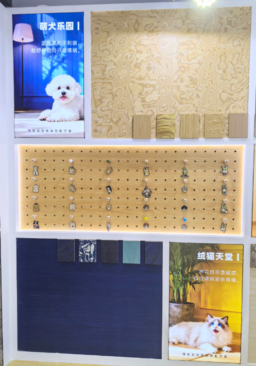 后疫情时代,健康舒适与人居关怀成为家居消费核心诉求。兔宝宝以环保实木基材为内核,通过场景化设计精准覆盖多元需求:针对都市青年萌宠陪伴生活,推出专属主题木皮,以低饱和色彩与环保材质为“撸宠空间”注入治愈质感;温润柔和的木皮系列则兼顾老人静谧需求与儿童健康守护,实现全龄段人居关怀。同时,依托核心专利技术,兔宝宝科技木在保留天然木材纹理优势的基础上,实现防腐、防蛀、耐潮等性能升级,环保标准达国际领先水平。