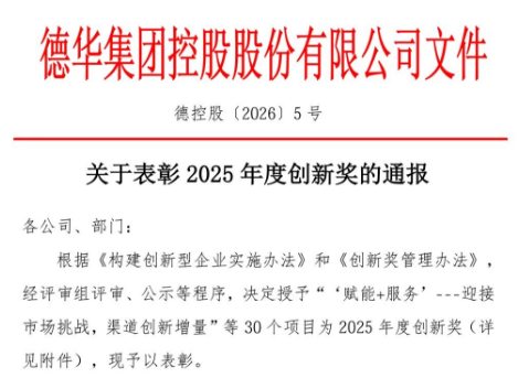近日,德华集团发布2025年度“创新奖”评审结果,经过严格评审与公示,共评选出30个获奖项目,涵盖技术创新、管理优化、营销突破等多个领域。自2008年启动创新奖评选以来,公司已连续18年以创新驱动发展,累计产生各类创新成果317项,持续激发全员创新活力,为企业高质量发展注入强劲动能。
