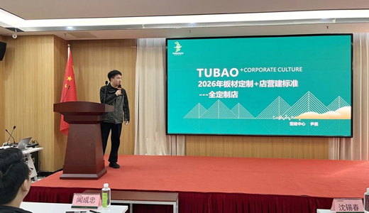 会议围绕总结复盘与战略部署展开。山东销售公司负责人闻成忠回顾了2025年工作成果,并对2026年区域发展路径作出系统规划。兔宝宝定制+、家具厂、饰材活动、营建、商学院及五金运营等板块负责人先后就渠道运营、门店营建标准、政策解读、新品推广、新零售规划及赋能支持进行专题分享,内容务实、方向清晰。