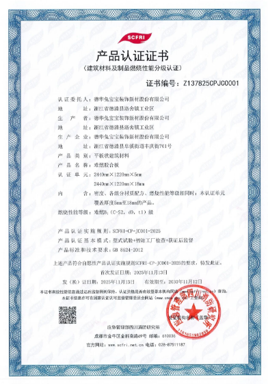 近日,兔宝宝难燃胶合板获得由应急管理部四川消防研究所颁发的行业首张“建筑材料及制品燃烧性能分级认证”难燃B1级证书。该认证严格遵循SCFRI-CP-JC001-2025实施规则与GB 8624-2012国家标准,标志着该产品继中国绿色产品认证后,再添一项权威安全背书,进一步彰显了公司在燃烧安全性能方面的卓越实力。