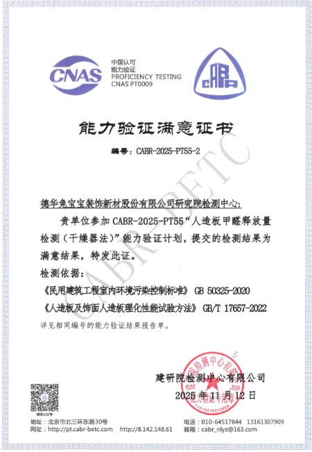 由建研院检测中心有限公司组织的“CABR-2025-PT55人造板甲醛释放量检测(干燥器法)”,以及国家林业和草原局林产品质量和标准化研究中心组织的“2025年人造板干燥器法甲醛释放量的测定”能力验证中,兔宝宝检测中心均以优异成绩斩获“满意”评价证书。这标志着该中心在人造板甲醛释放量检测领域的技术能力持续处于领先水平。