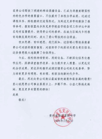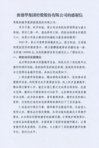此次收到的感谢信,是认可更是激励。多年来,德华始终以生生不息的企业精神为引领,将担当、创新、奋斗、求真融入发展血脉,积极投身公益、践行社会责任。未来,公司将继续践行企业担当,深耕公益之路,以实际行动助力教育事业发展,让爱心与责任持续传递,为更多学子点亮成长希望,用点滴善举汇聚成推动社会发展的温暖力量。